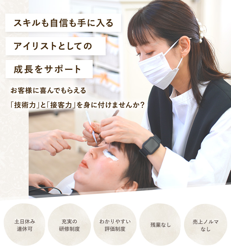研修は随時設けており、アイリストとして自信を持ち仕事にやりがいを感じながら自己成長することができます。